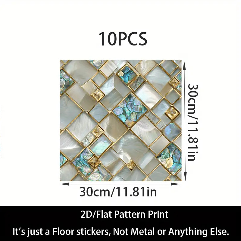 TEMU 10개입 2D 평면 비닐 바닥 스티커, 11.81x11.81인치 정사각형 타일, 블루, 그린, 골든, 화이트 대리지 패턴, 내구성 PVC. 주방, 욕실, 거실, 침실, 기숙사 장식용 - 쉬운 DIY 홈 데코, 자가 접착 고품질 욕실 바닥 타일, 주방 업그레이드, 우아한 디자인, 쉬운 설치 타일, 2D 평면 스티커