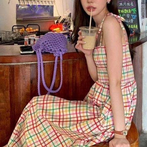 [에이치플러스몰]여름철 베이직 체크원피스 끈나시 스모크밴딩 올데이