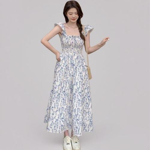 [신상오픈런]여성 프릴 스모크 밴딩 스퀘어넥 민소매 롱 드레스 (35333417)