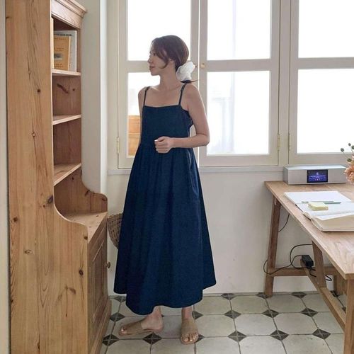 [옷자락] 여성 오버사이즈 스모크 밴딩 스트랩 나시 청 롱 드레스