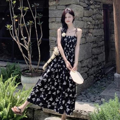 [신상오픈런]여성 여름 꽃무늬 스모크 어깨끈 쉬폰 롱 드레스 (33139482)