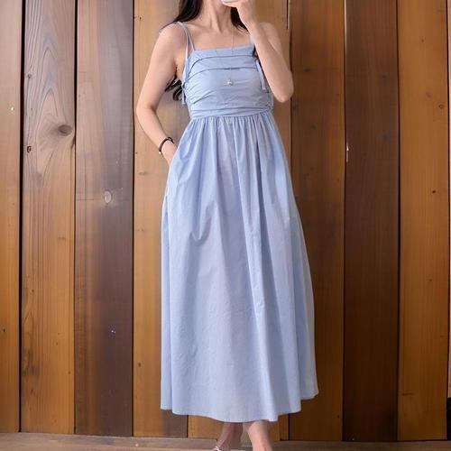 [신상오픈런]여성 해변 원피스 리본 장식 스모크 코튼 여름 롱드레스 (33143713)