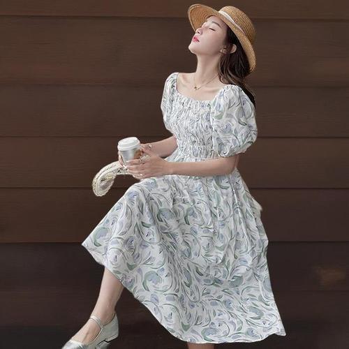 [신상오픈런]여성 꽃패턴 스모크 밴딩 퍼프소매 쉬폰 긴 원피스 (33435664)