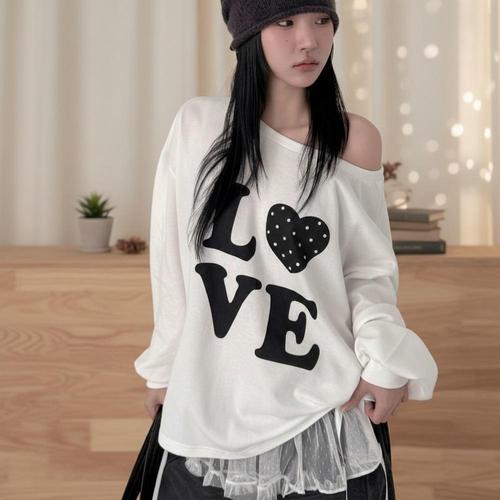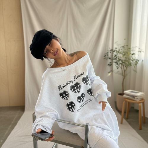 [옷자락] 여성 하트 프린트 긴팔 오프숄더 맨투맨 봄용 루즈핏