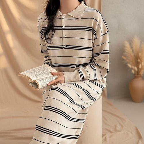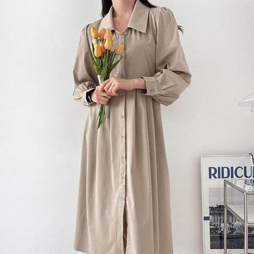 [옷자락]여성용 소프트 니트 롱 원피스 버튼카라 넥