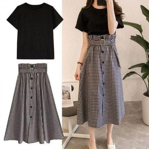 [에이치플러스몰]반팔 블랙 캐주얼 체크 스커트 필수템 투피스 세트