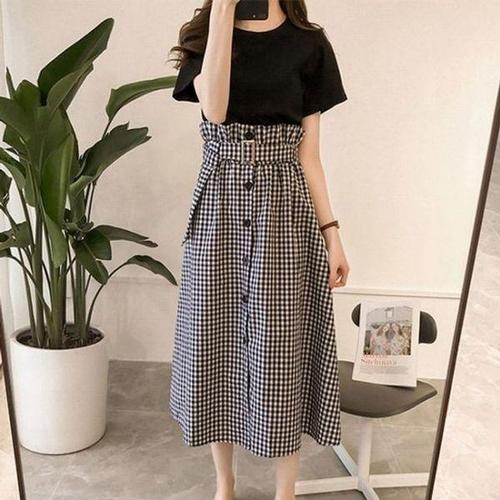 [에이치플러스몰]롱 체크 추천 스커트 반팔 꾸안꾸 투피스 세트 US 봄