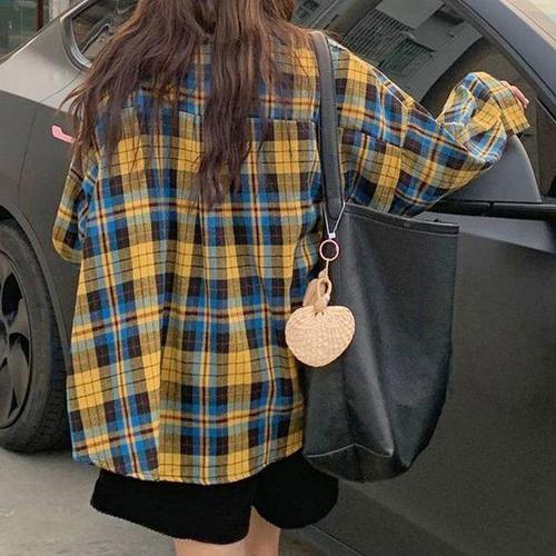 [에이치플러스몰]오버핏 여자 카라 셔츠 체크무늬 캐주얼 스쿨룩 코디