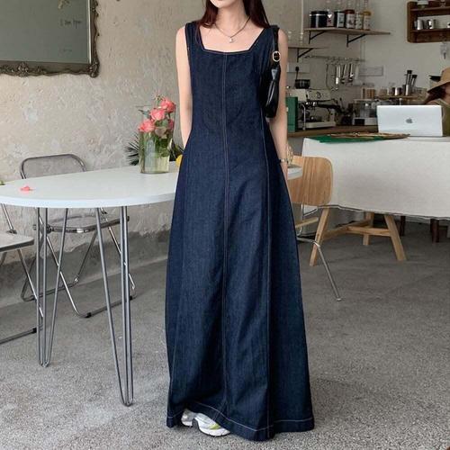 여자 데님 박시 청순룩 스퀘어넥 캉캉 롱원피스