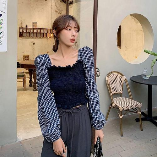 러블리 트렌디 크롭 스퀘어넥 페미닌 스모크 블라우스