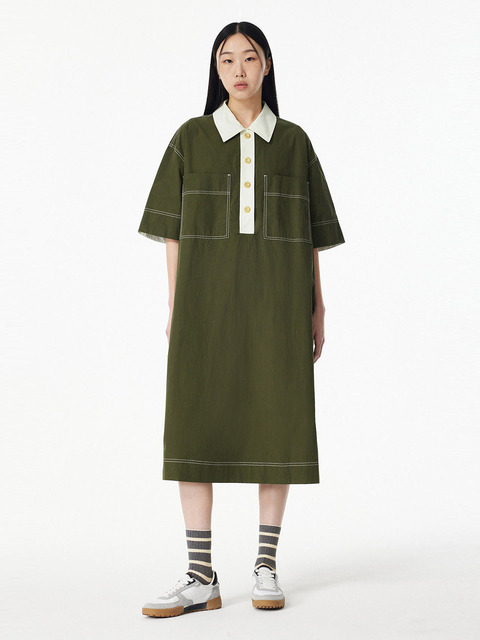 [스튜디오 톰보이] 배색 카라넥 반팔 원피스_다크카키 9176241983