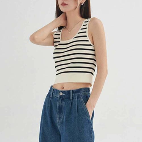 [오노마] ONM 여성 블랙 니트민소매 스트라이프 크롭 니트 나시티