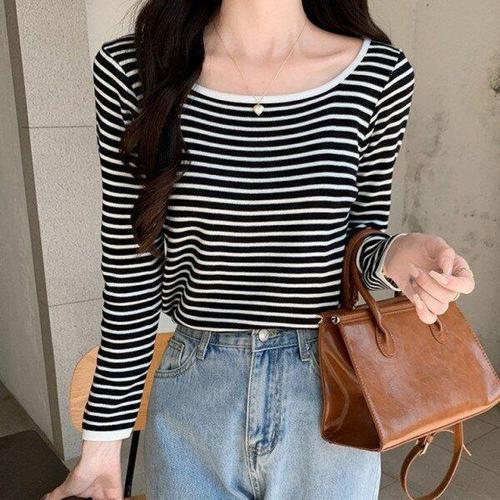 [모노무드]LMO 가로줄 우먼 프리미엄 탑 줄무늬 니트셔츠 유넥탑