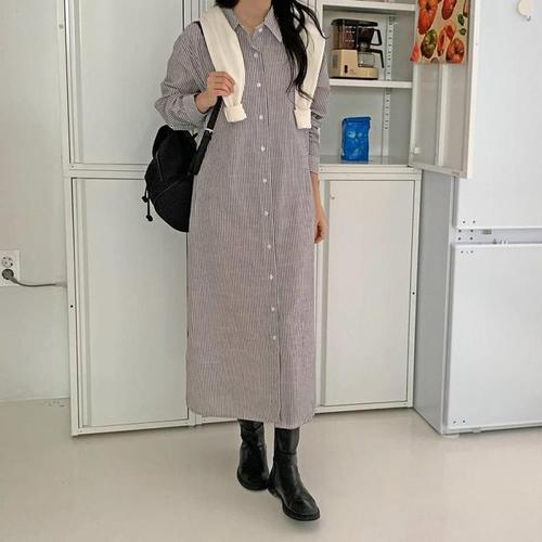 [신상오픈런]스트라이프 종아리기장 코튼 긴팔 셔츠원피스 (29704492)