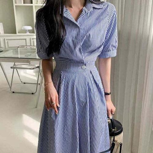 [오너클랜]인기상품 여성 하객룩 데일리 스트라이프 뒷밴딩 셔츠 원피스 [WFJHIYC_251110]