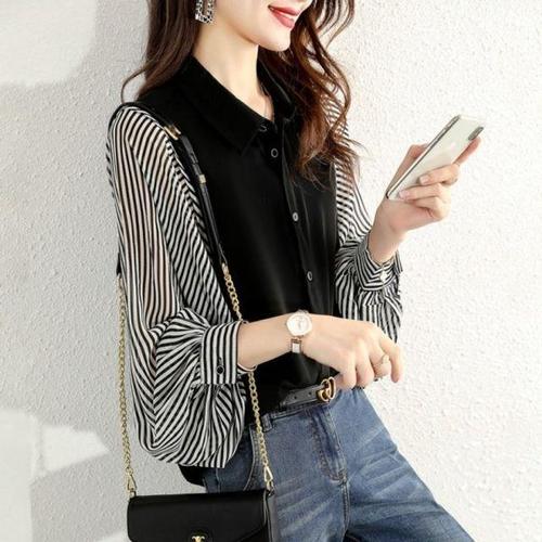 쉬폰 LF26300 얇은 소매 블라우스 줄무늬 셔츠 카라
