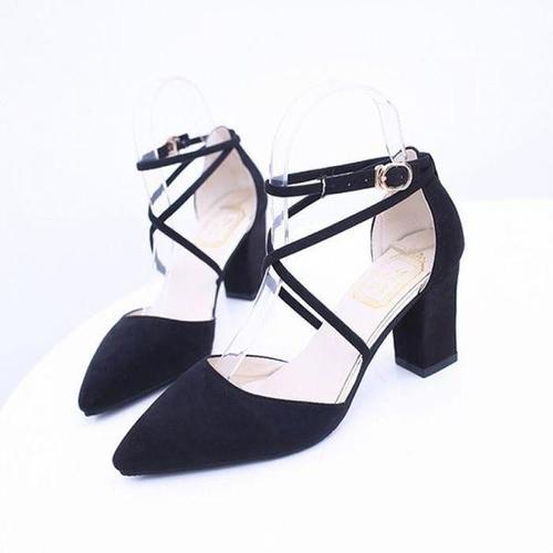 [셀러허브_여성트랜드패션]뾰족코 스트랩 키높이 통굽 스틸레토힐 미들힐