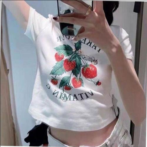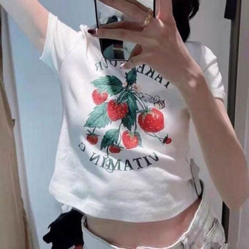 [에이치플러스몰]반팔 귀여운 캐주얼 크롭 면티 필수템 딸기 티셔츠 블