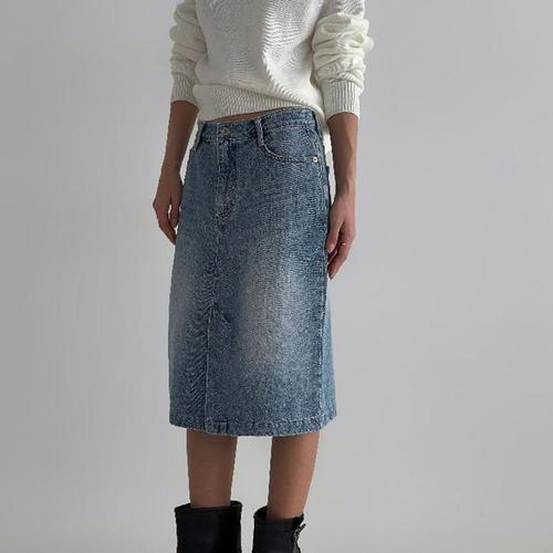 [신상오픈런]앞트임 중청치마 워싱진 논스판 일자 데님스커트 (31707842)