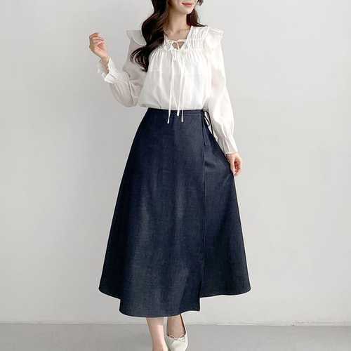 옷자락 / 여자 데이트룩 봄옷 리본 랩치마 데님 스판 롱스커트
