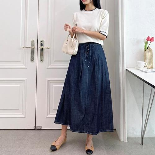 [신상오픈런]청치마 에이라인 허리끈 스티치아웃 논스판 봄데님 (31605140)
