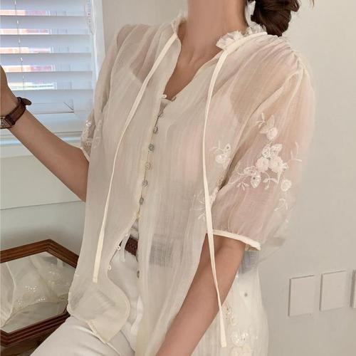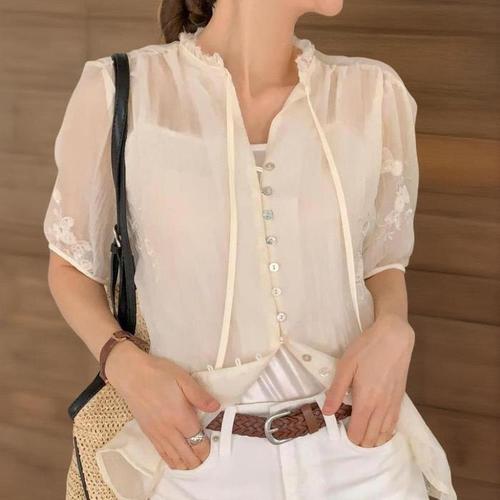 [신상오픈런]여성용 스팽글 꽃무늬 시스루 리본 자수 블라우스 (37001240)