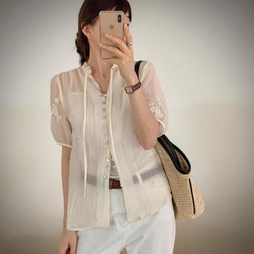 [신상오픈런]여성 스팽글 꽃무늬 리본 자수 시스루 블라우스 (37001230)