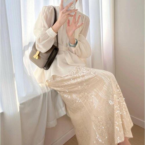 봉봉스토리 샤이니 스팽글 여성 롱 스커트 하객룩 허리밴딩