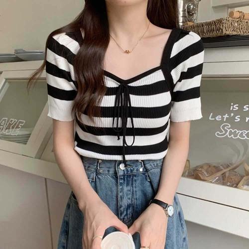[셀럽하우스]스프라이트 BMGI4855 스퀘어 리본 포인트 반팔 니트 데일리
