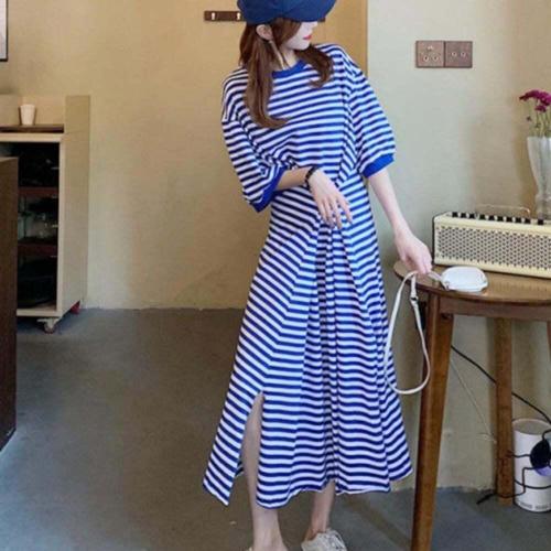 [엄지척]캐주얼 줄무늬 스프라이트 반팔 롱 원피스_19912104_667501