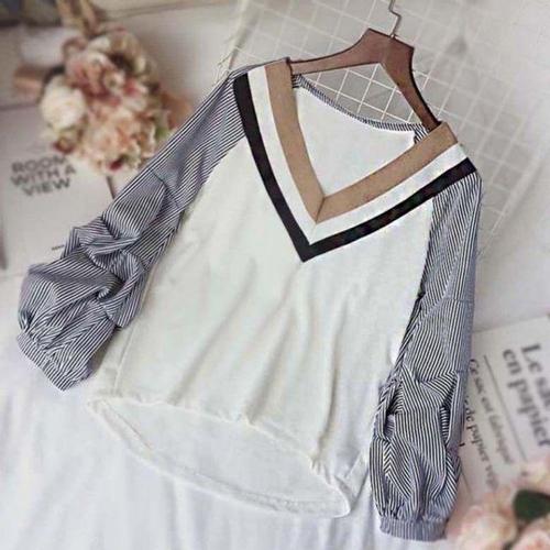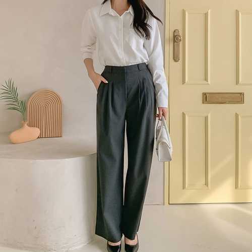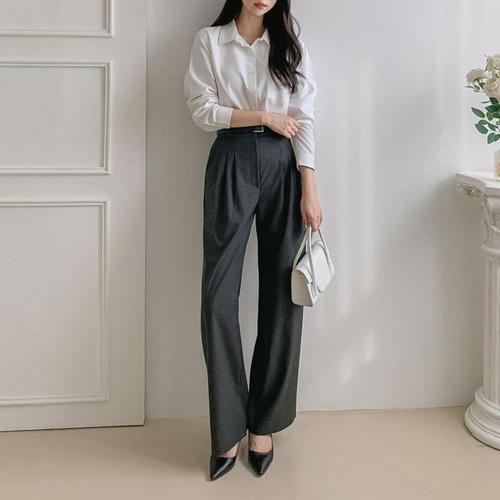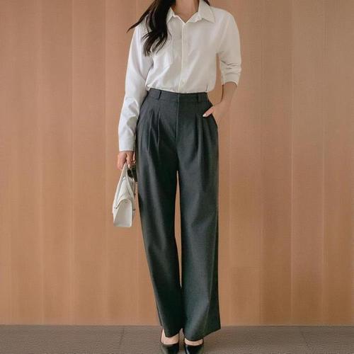 [셀럽하우스]투버튼 WFMK0598 짧은 세로 스트라이프 셔츠 슬랙스 코디