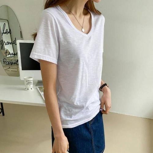 [드리다]여자 여름 슬라브 브이넥 반팔 면 흰색 티셔츠 40-50대 미시 중년 여성 캐주얼 등원 엄마옷