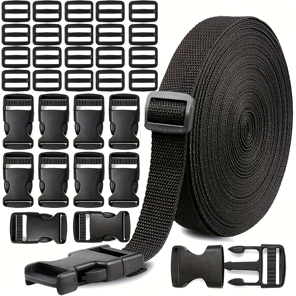 TEMU 10m 헤비듀티 퀵릴리스 버클 세트 - 10m 나일론 웨빙 스트랩, 10개 사이드릴리스 버클 & 20개 슬라이드, 이중 조절 버클, 짐, 애완동물 목걸이용, 블랙, 안전한 잠금, 내구성 플라스틱, 튼튼한 구조, 케이블 타이 헤비듀티