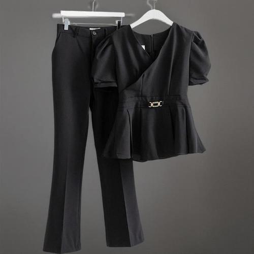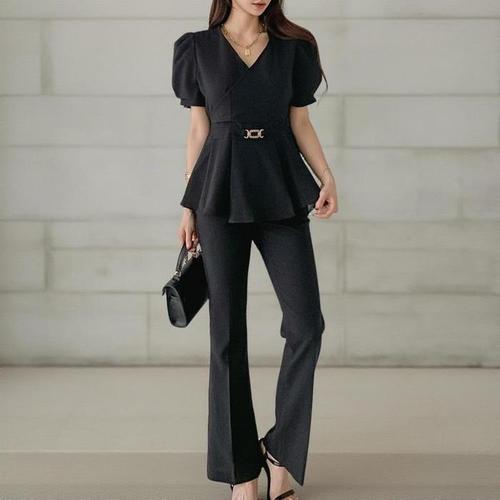 [신상오픈런]여성 하객룩 벨트 페플럼 랩 블라우스와 부츠 슬랙스 세트 (39115182)
