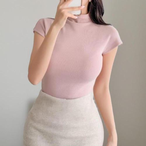 [신상오픈런]여성 슬림핏 무지 컬러 하프넥 반팔 티셔츠