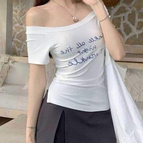 [에이치플러스몰]여성 유니크 슬림핏 디자인 심플 트렌디 레터링 오프숄더 립 반팔 티셔츠
