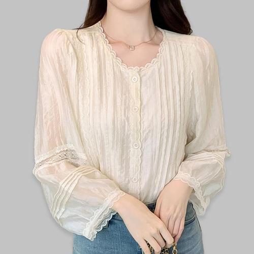 [옷자락]여성용 레이스 리본 칼라 시스루 블라우스