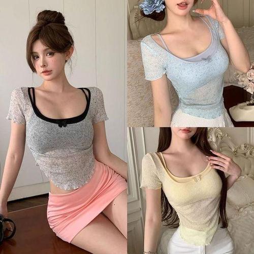 구디프 여성용 매쉬 그물망 소재 크롭 레이어드 반팔 티셔츠