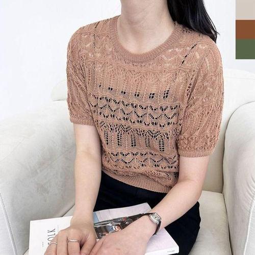샵앤) 국산 여성 시스루 펀칭 라운드 반팔 니트 티셔츠 WDM-WKN-2LCBB1064
