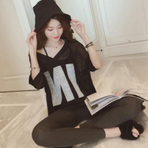 [에이치플러스몰]여성 여름 나시 반팔 시스루 티 셔츠 세트 블랙