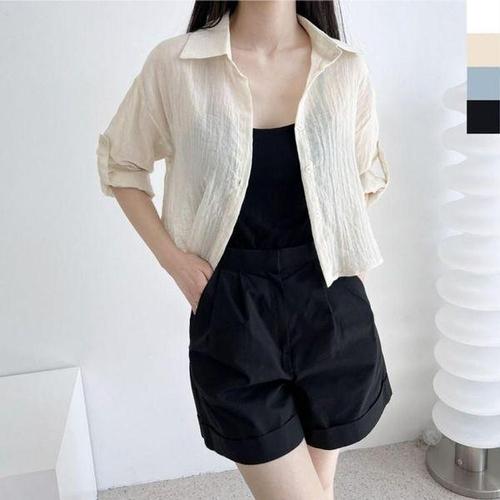 [에이치플러스몰]여름 반팔 긴팔 크롭 여자 시스루 셔츠 남방 롤업
