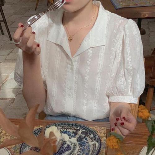 [에이치플러스몰]여성 여름 데일리 퍼프 시스루 반팔 프릴 블라우스