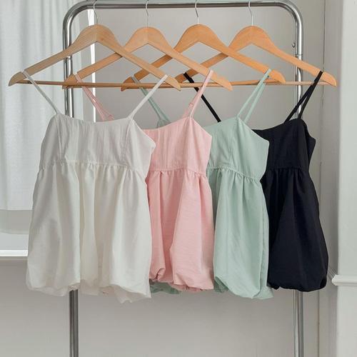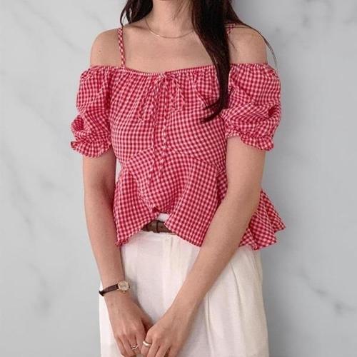 [다잇템]여성 리본 격자 스모킹 볼드숄더 탱크 셔츠