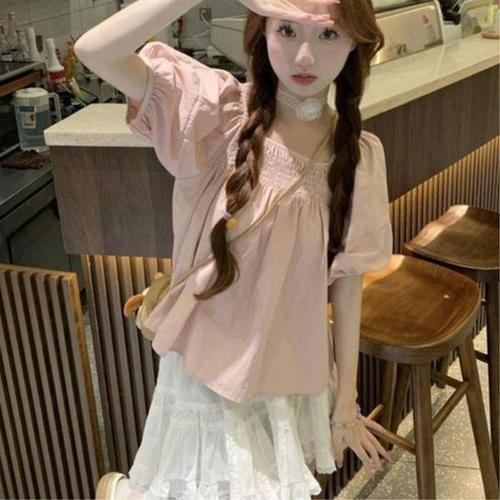 [다잇템_패션]여성 스퀘어넥 후레아 스모킹 반소매 블라우스