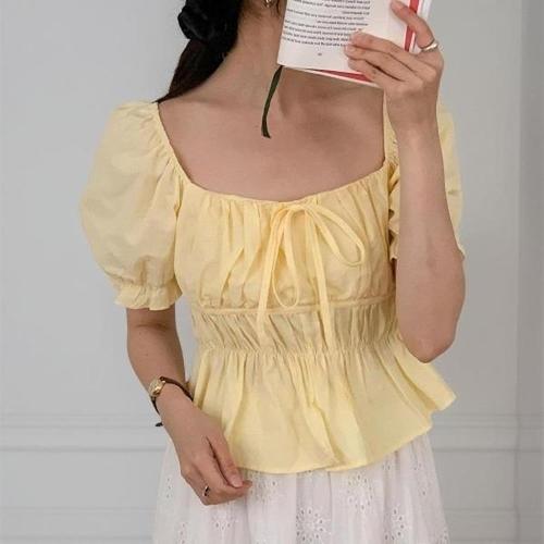 [다잇템]여성 반소매 후레아 스모킹 스퀘어넥 블라우스