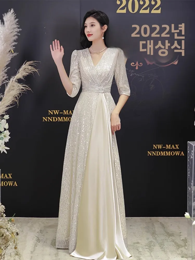 우아한 이브닝 가운 여성 호스트 볼 공연 의상 반짝이는 스팽글 미디 드레스 지퍼 스타일 슬림핏 롱 스커트