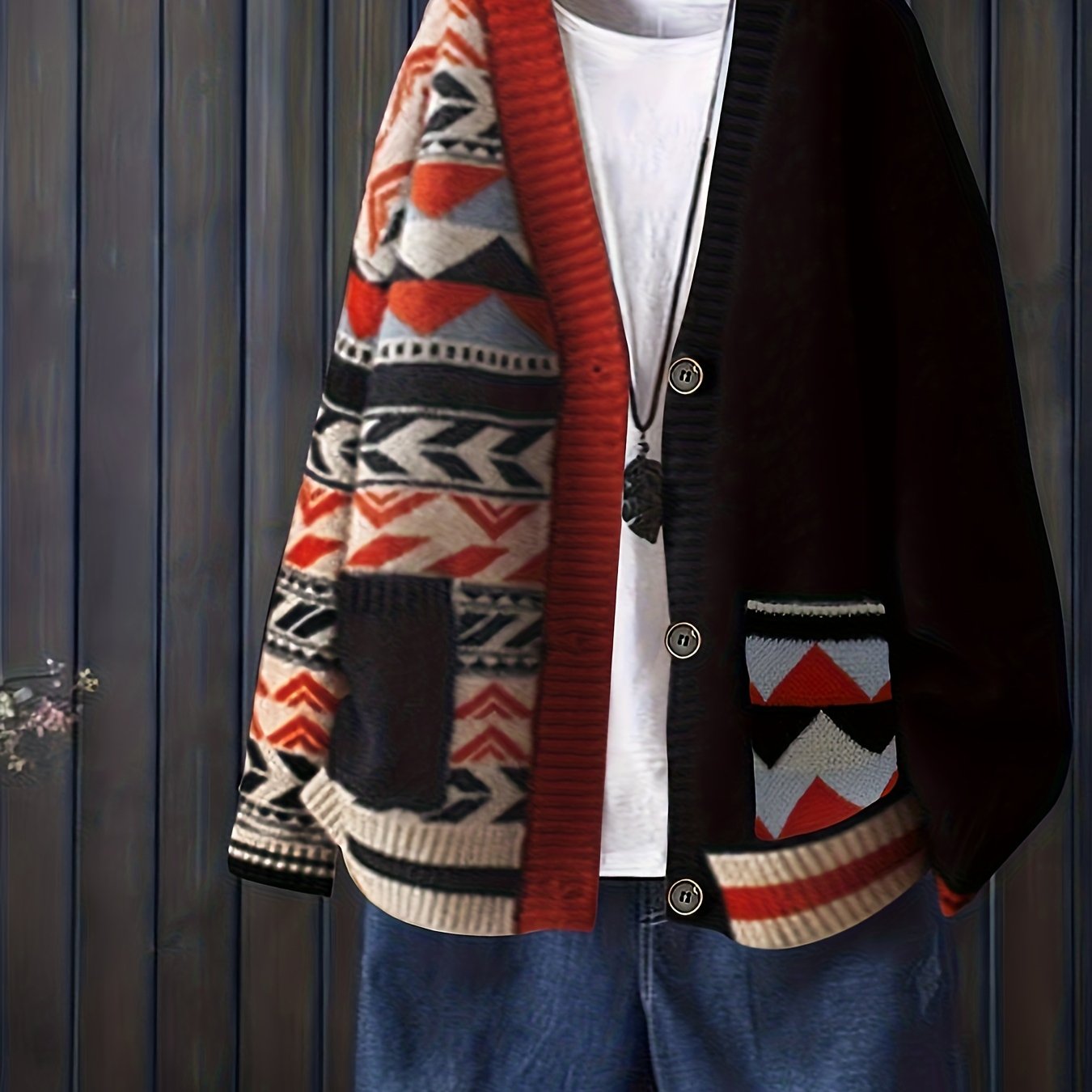 TEMU 유럽&미국 스타일 우아한 가을 겨울 V넥 기하학 패턴 카디건 스웨터, 세련된 디자인|가디건