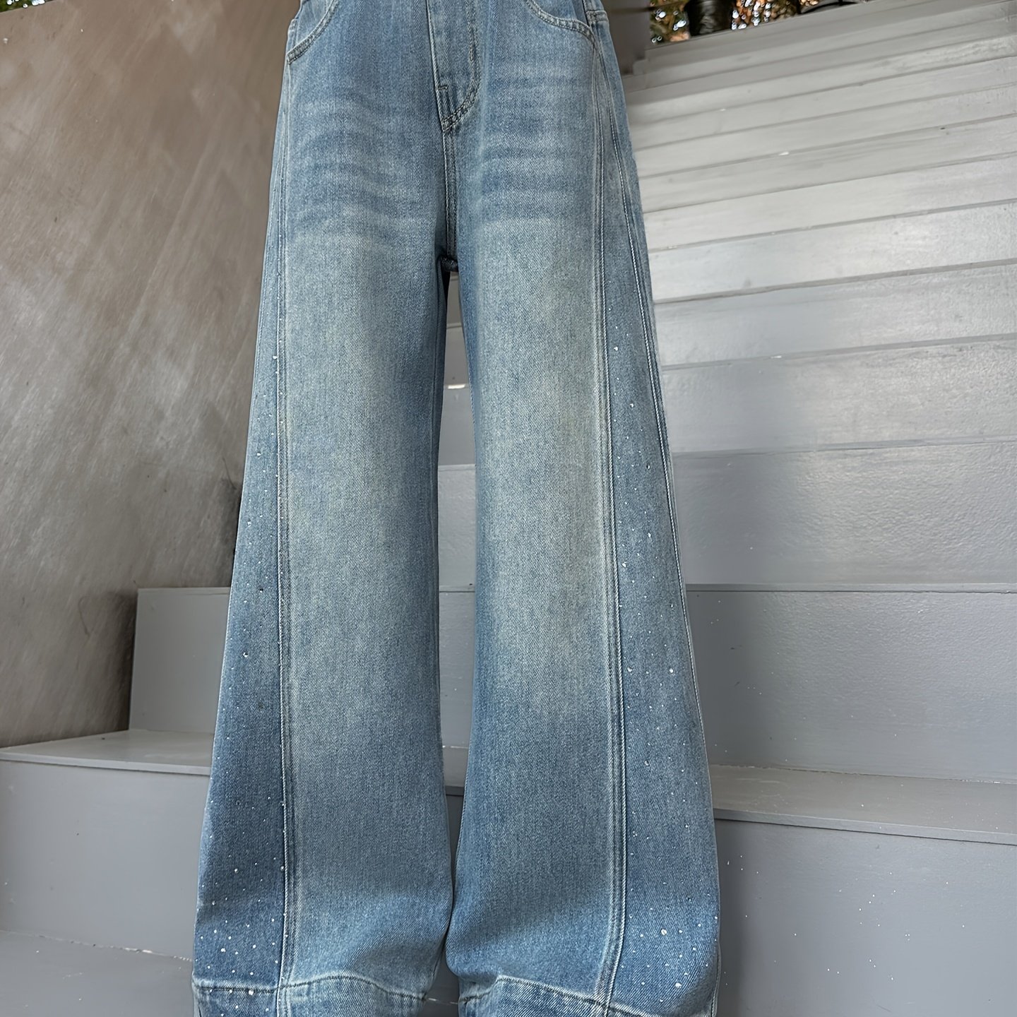 TEMU 청소년 봄/가을 라인스톤 페이크 데님 스타일리시 다용도 캐주얼 와이드 레그 팬츠 루즈 롱 트라우저, 야외복, 십대용