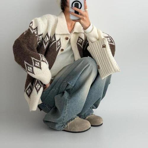 [다잇템]여자 벌룬 박시핏 콘트라스트 아가일 가디건