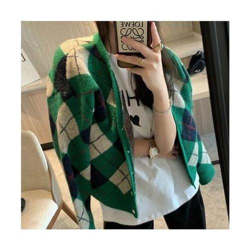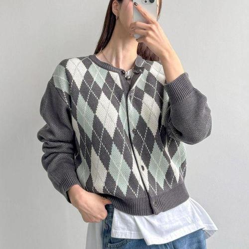 [에이치플러스몰]여성 아가일 패턴 캐주얼 외출 데일리 다이아 가디건 가을가디건 니트가디건 라운드니트..